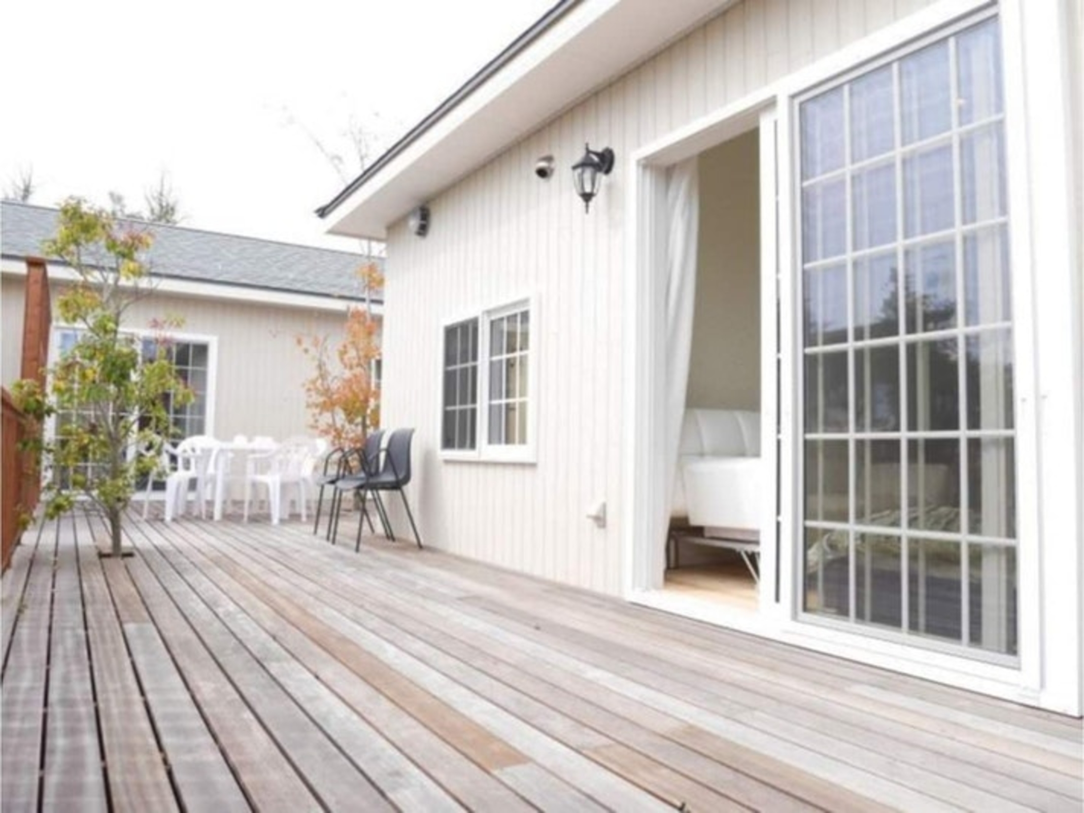 「ポーラーリゾート西軽井沢1」は、西軽井沢の別荘地に位置するアメリカンスタイルの貸別荘です。白を基調としたラグジュアリーな内装の3LDK平屋で、広々とした回廊型ウッドデッキが建物の中心にあり、すべての部屋と繋がるユニークな設計が特徴です。床には、素足に優しい天然無垢パインのフローリングが使用されており、リラックスできる空間が広がっています。キッチンや全室冷暖房、乾燥機付き洗濯機などの設備も整っており、快適な別荘ライフを満喫することができます。
