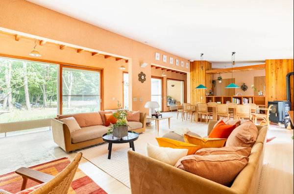 「HUTTE GARTENLAND -KAIZUKA-」は、軽井沢駅から車で7分という好立地にある貸別荘です。外観と内装は洗練されたおしゃれなデザインで、手入れの行き届いたガーデンが非日常感をさらに引き立てます。バーベキューはできませんが、近隣にはビストロやイタリアン、フレンチなどの人気店が複数あり、外食でも十分に満足できます。ペットOKなのも嬉しいポイントです。ドッグランはありませんが、徒歩約6分の場所にある「湯川ふるさと公園」には無料で利用できる大型ドッグランがあり、ペット連れの滞在にもおすすめの貸別荘です。